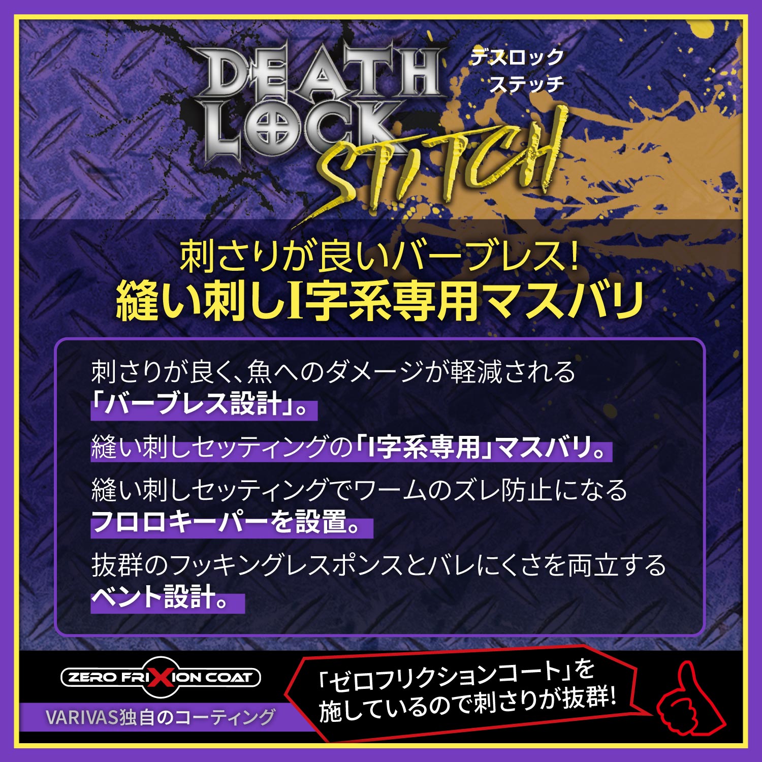 究極の食わせテクニック「I字系」に特化した専用フックが ここに誕生! ・刺さりが良く、魚へのダメージが軽減される「バーブレス設計」。 ・縫い刺しセッティングの「I字系専用」マスバリ。 ・縫い刺しセッティングでワームのズレ防止になるフロロキーパーを設置。 ・抜群のフッキングレスポンスとバレにくさを両立するベント設計。 ・VARIVAS独自のコーティング「ゼロフリクションコート」を施しているの で刺さりが抜群。