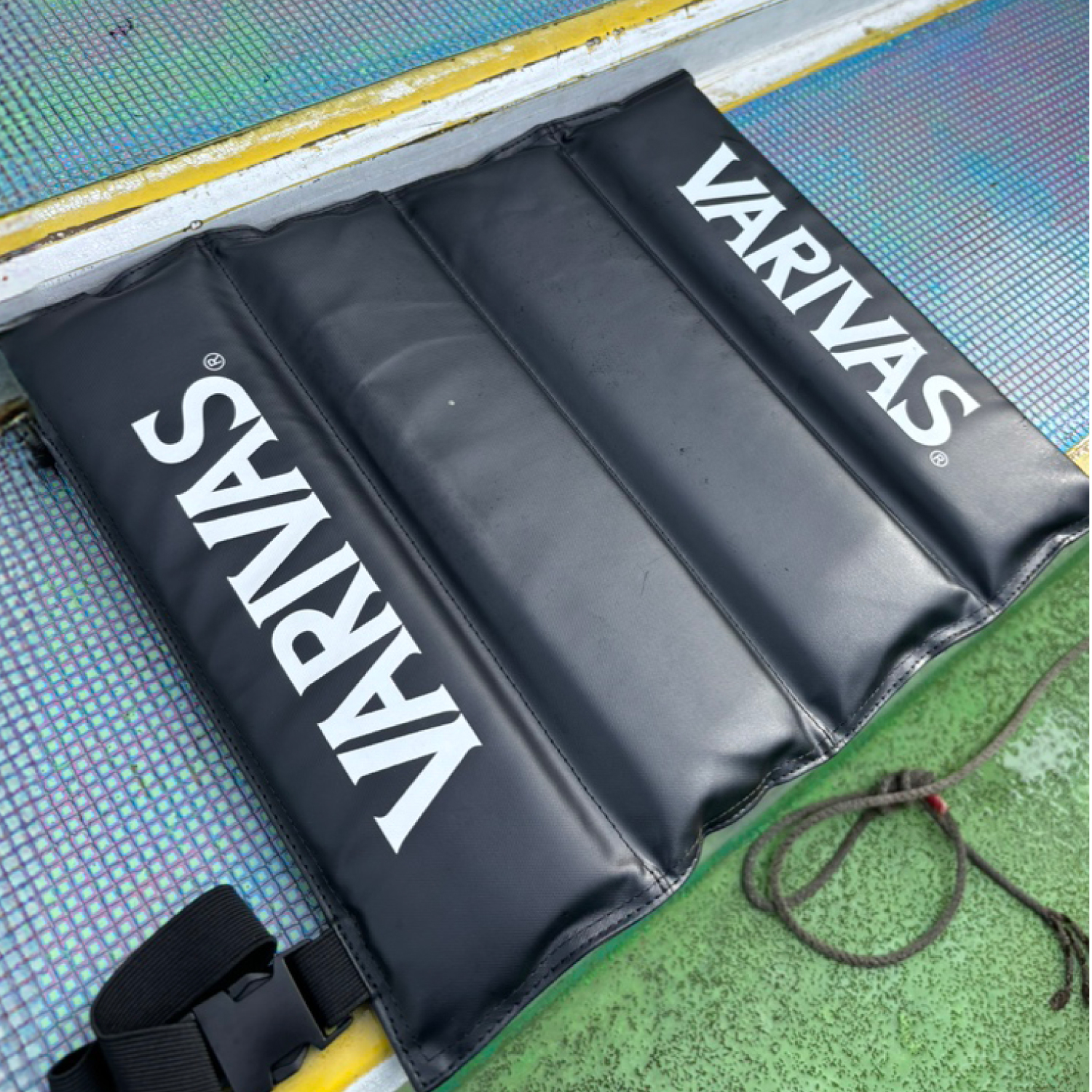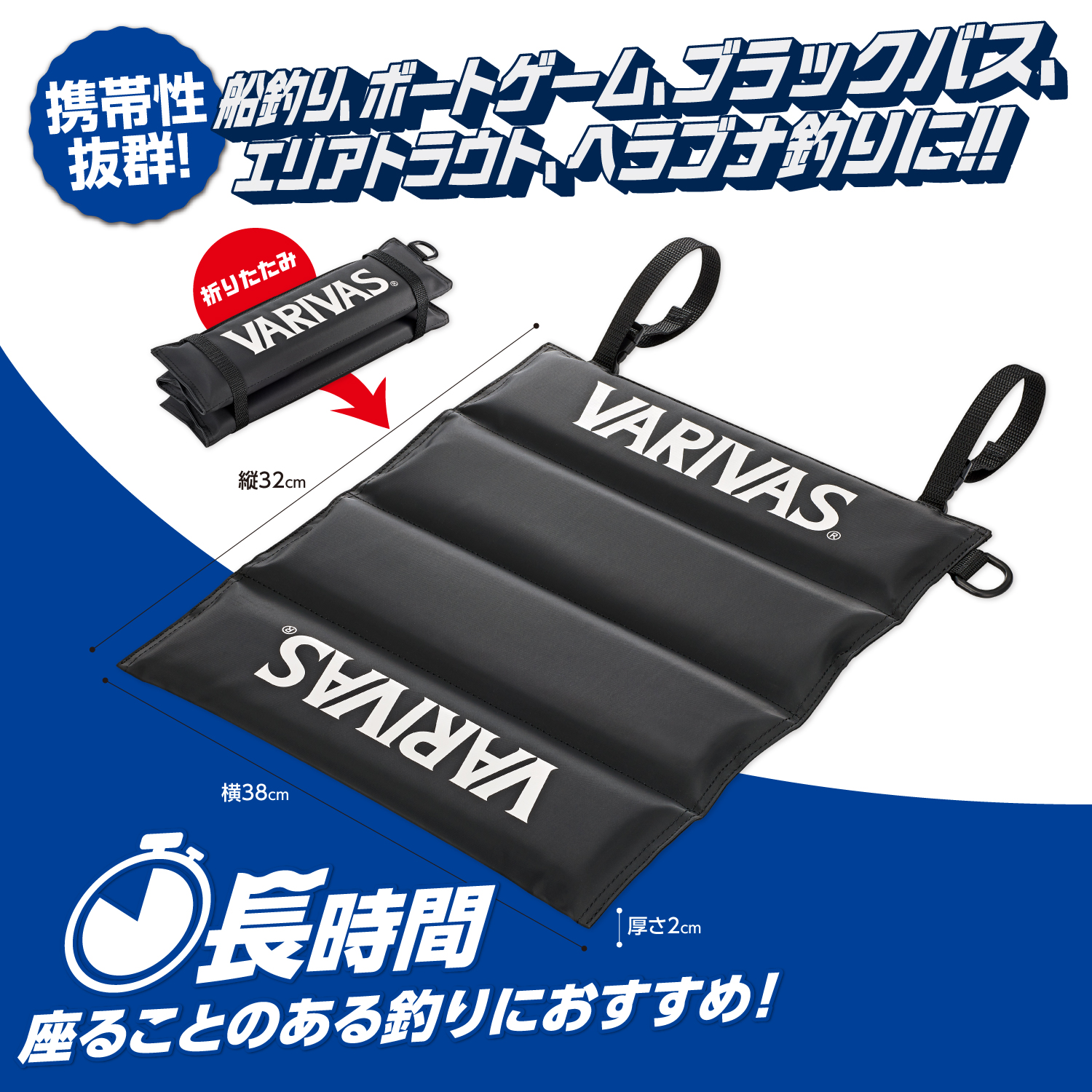 2025年10月発売予定携带性极佳!! 适用于船钓、路亚、黑鲈钓、鳟鱼、鲫鱼等!! 推荐给需要长时间坐着垂钓的钓友! 配备可安装登山扣的D形环; 配备可固定坐垫的收纳绑带; 可以安装在钓箱的肩带上; 可以安装在硬质收纳箱的提手上; 颜色:黑色;规格:38×32×2cm 材质:本体-PVC防水油布,PE软质垫子,POM(D环形 填料)。